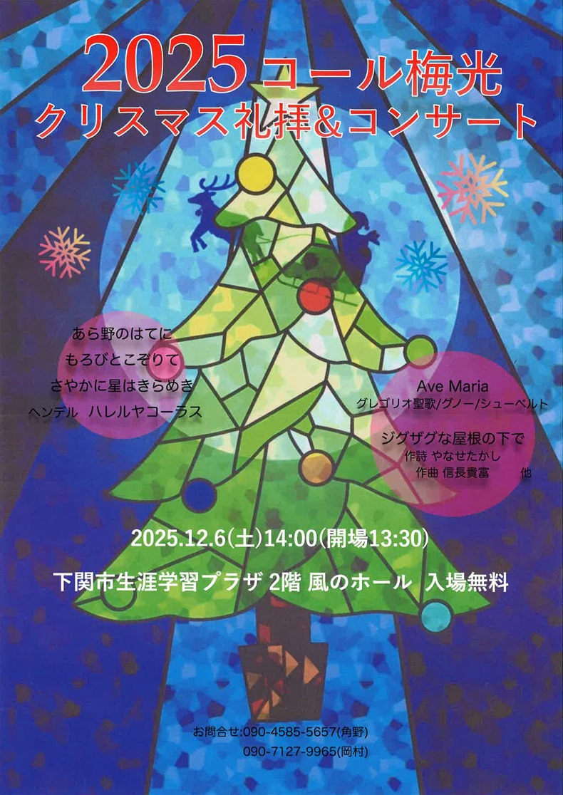 2025コール梅光クリスマス礼拝&コンサートのお知らせ 12月6日(於:下関市) 投稿者: 事務局2025年11月14日お知らせ、コンサートのお知らせ、卒業生の活動、遊・友・座 同窓生によるコーラスグループ「コール梅光」から、クリスマス礼拝&コンサートのお知らせです。 クリスマス礼拝&コンサートのお知らせ2025 「2025コール梅光クリスマス礼拝&コンサート」 2025年12月6日(土)14:00~(13:30開場) 下関市生涯学習プラザ 2階 風のホール 入場無料 あら野のはてに もろびとこぞりて さやかに星はきらめき ヘンデル ハレルヤコーラス Ave Maria グレゴリオ聖歌/グノー/シューベルト ジグザグな屋根の下で 作詞 やなせたかし 作曲 信長貴富 他 ぜひお誘いあわせのうえお出かけください。