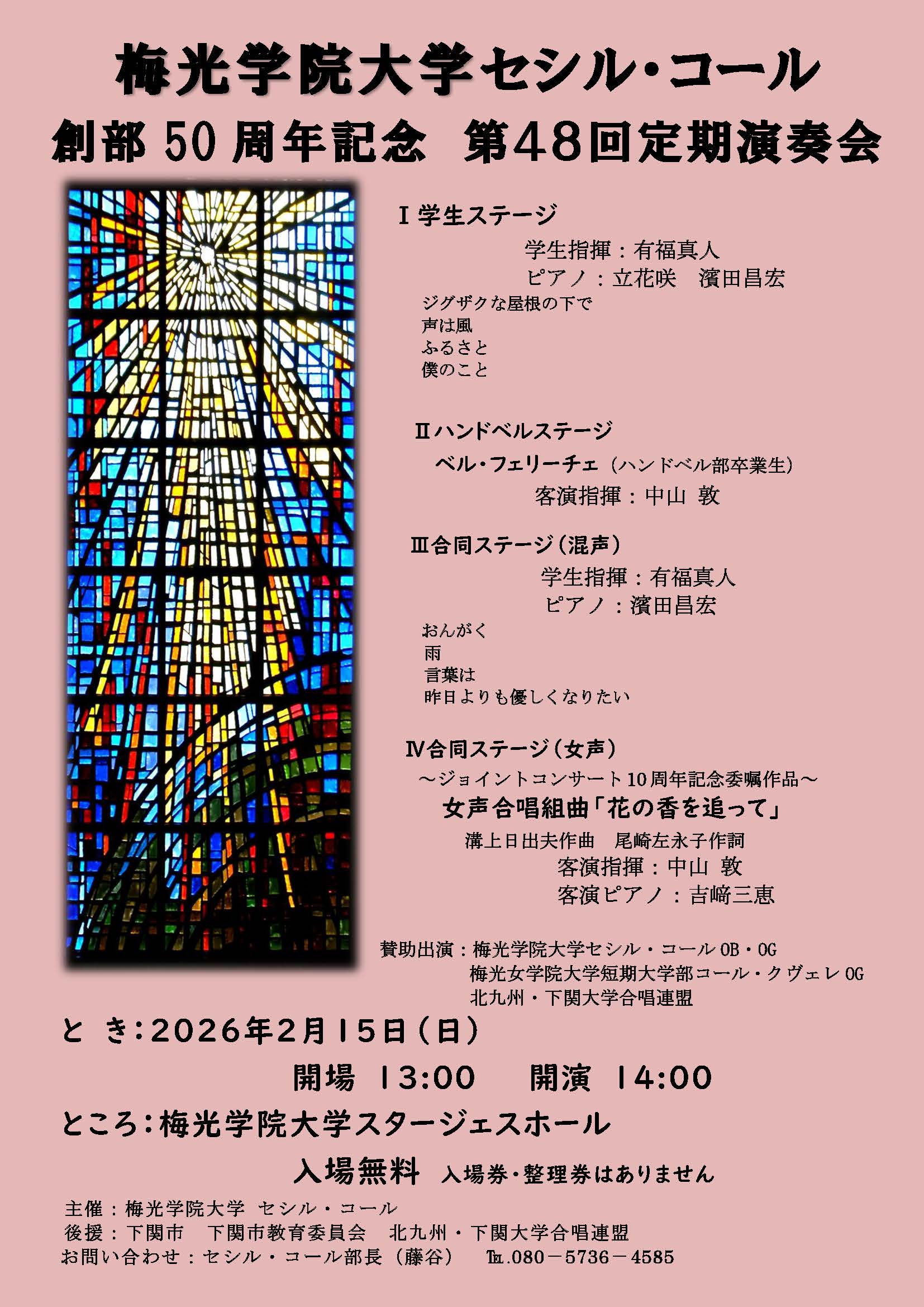2026年2月15日に大学スタージェスホールで開催される、セシル・コール創部50周年第48回定期演奏会のご案内が届きました♪