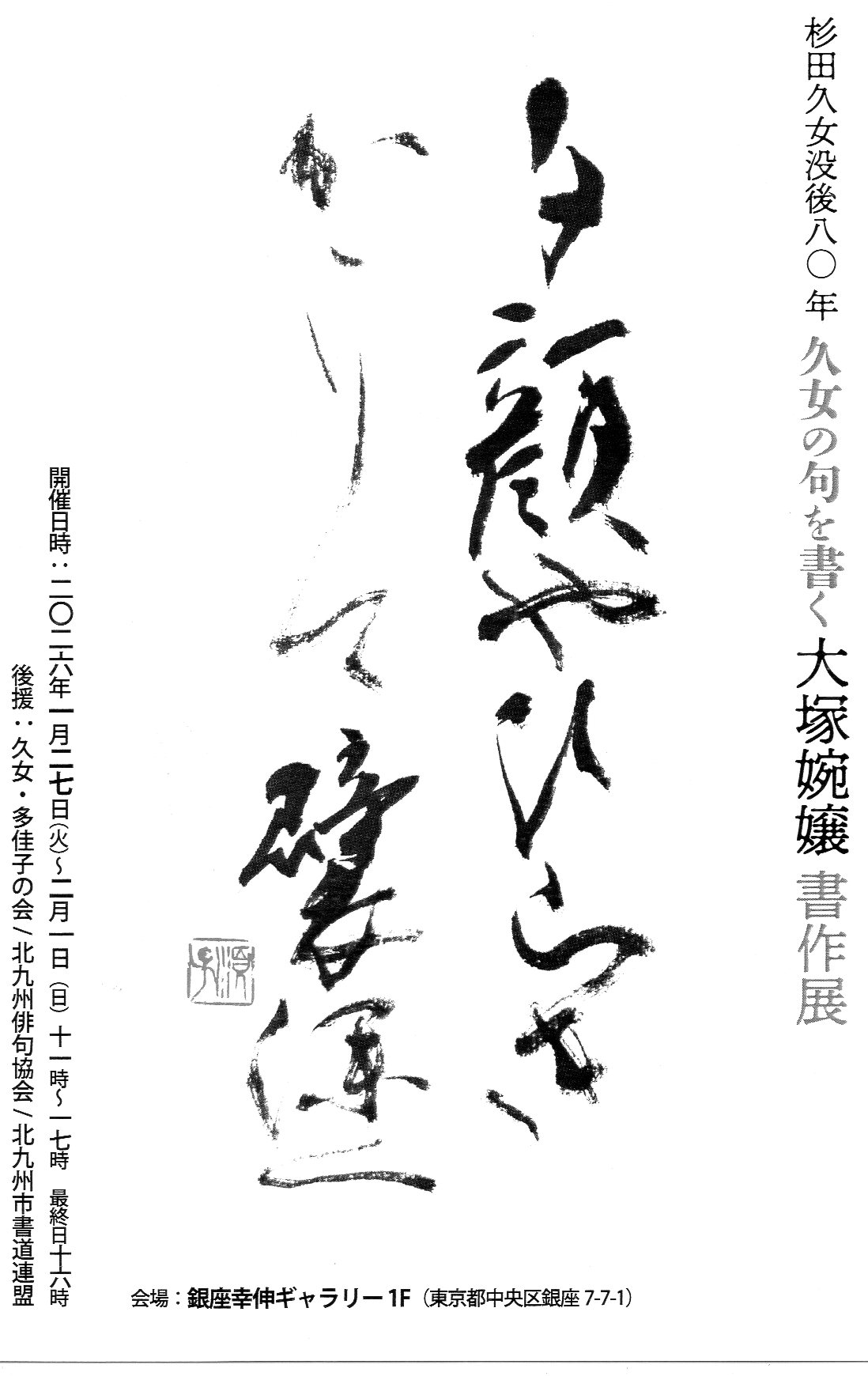 2025年11月28日お知らせ、卒業生の活動、遊・友・座 『杉田久女没後80年 久女の句を書く 大塚婉嬢書作展』|2026年1月27日-2月1日(於:東京・銀座) 卒業生の大塚(旧姓・木下)順子さん(大日文1 […]